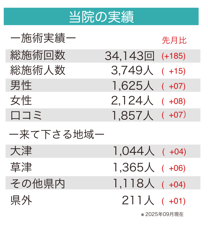 先月09月は185回の施術と新たに14名の新しい患者様を迎えました。