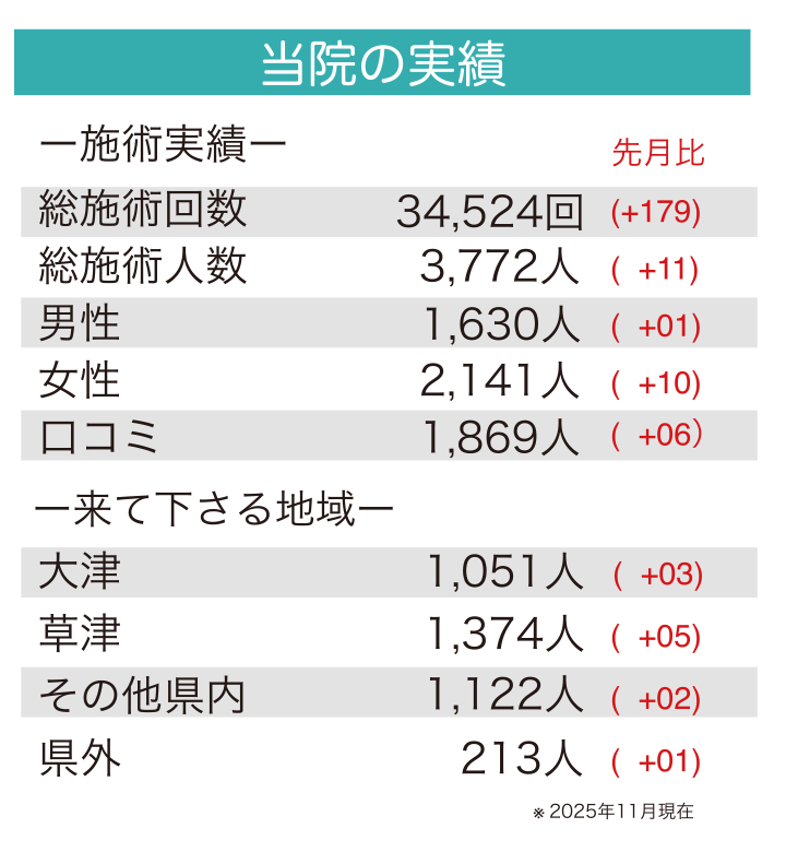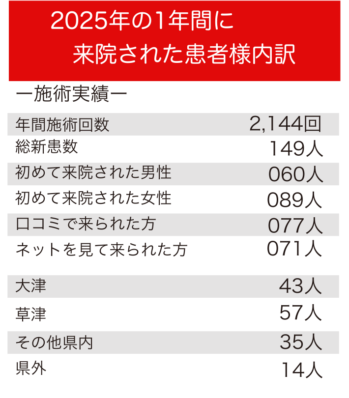 草津市内以外にも大津、栗東、守山はもちろん東近江、長浜など遠方から、また口コミで九州から四国、北陸、中国、関東、など日本全国各地から200名を超える県外からの患者様も多く来られます。
